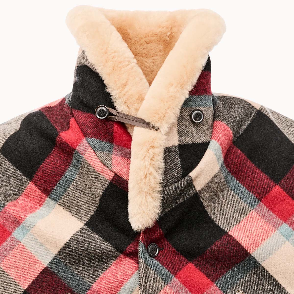 Dieser Filson Lined Mackinaw Wool Packer Coat Red/Cream/Blue Plaid ist eine außergewöhnlich warme Version von Filsons klassischem Packer Coat. Ausgestattet mit zwei Lagen extrem strapazierfähiger, regenabweisender 24-oz. 100% Mackinaw-Schurwolle über den Schultern, dem Rücken und den Armen, und verfügt über Filsons Signatur Alaskan Guide Flannel Futter und einen charakteristischem Shearling-Kragen. Die doppelte Wollschicht bietet überlegene Wärme und natürliche Wasserabweisung. Dieser Mantel ist für Bewegungsfreiheit geschnitten.